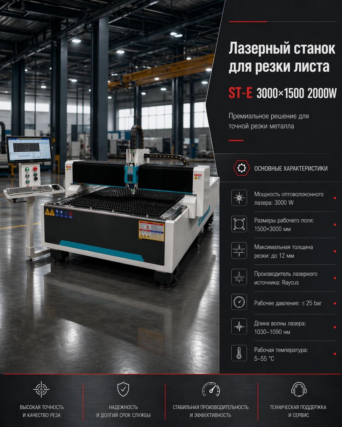 Лазерный станок для резки листового металла ST-E 3000×1500 2000W — это промышленное решение для точной и стабильной резки металлических листов на производстве. Модель подходит для предприятий, которым нужен надежный станок с рабочим полем 1500×3000 мм, оптоволоконным лазером 2000 Вт и высокой точностью обработки заготовок. Основные параметры этой модели на текущей странице товара: мощность 2000 W, формат 1500×3000 мм, толщина резки до 12 мм, источник Raycus и рабочее давление до 25 bar.